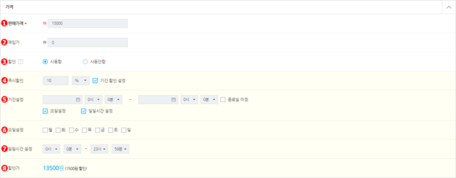 - 요일설정과 일일시간 설정을 통해 설정한 기간 중 원하는 요일이나 시간대를 설정하여 할인을 적용할 수 있습니다.